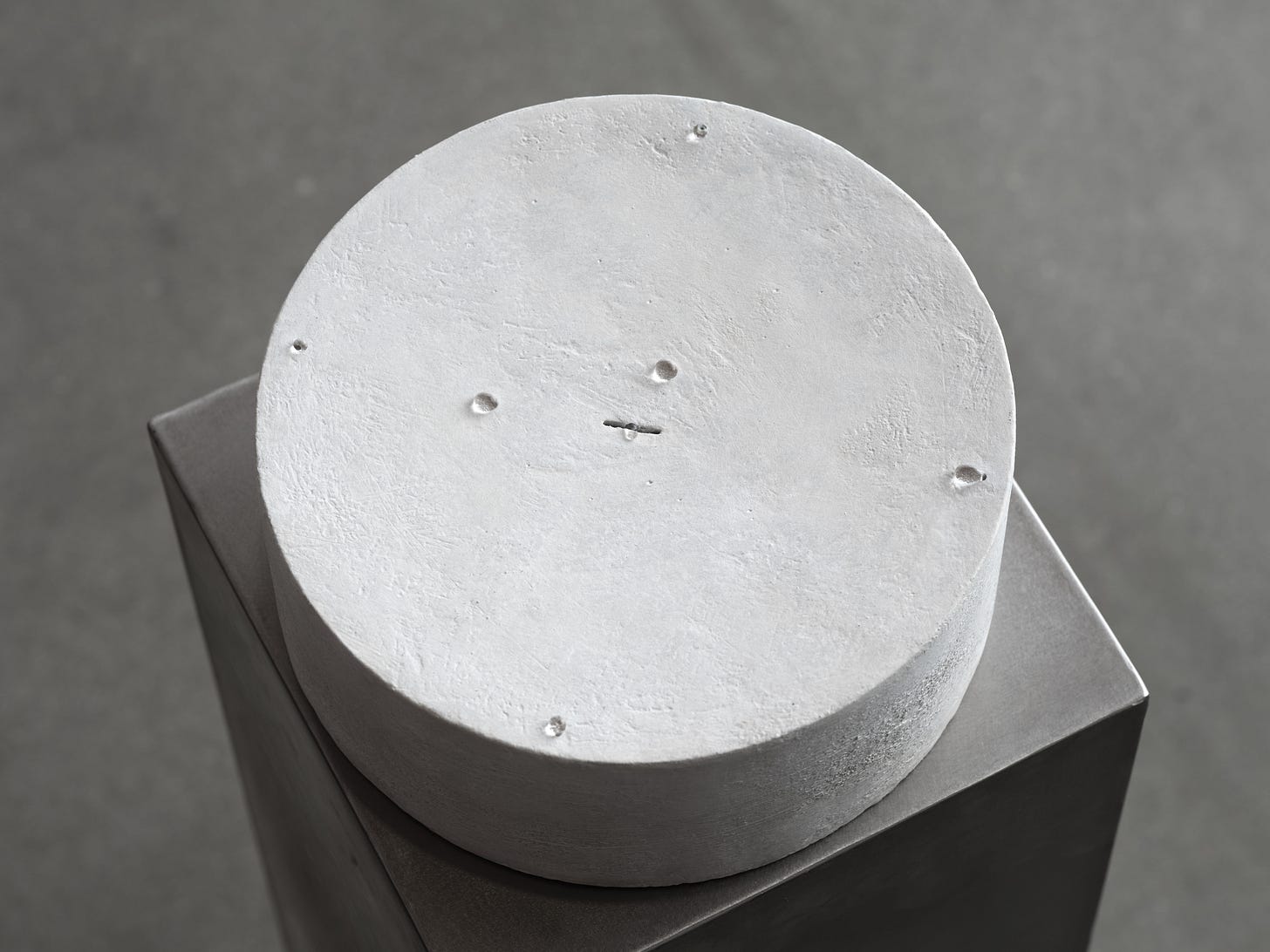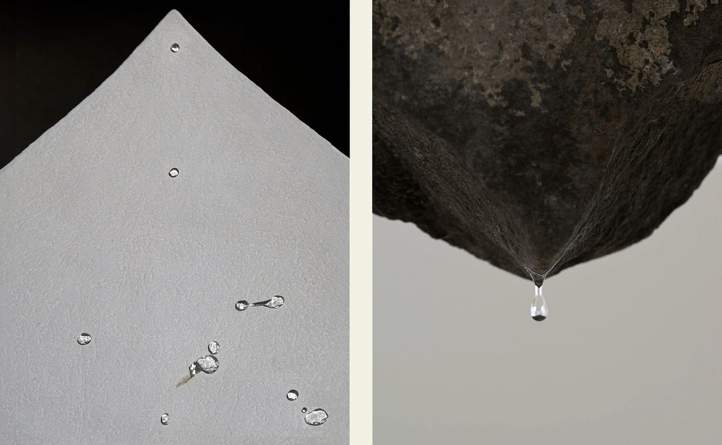 From Ghebaly: “Clark delicately suspends a roughly hewn alabaster boulder at the center of the room. The seemingly weightless rock is poised above a recipient steel basin, and releases water in slow, singular droplets. Upon reaching the basin, each droplet creates outward ripples, and as surface tension tries to flatten them back out the ripples return inward…the works ruminate on time, erosion, and reflection, tracing the cyclical forces of gravity and how they shape our materiality, landscape, and inner terrain.”